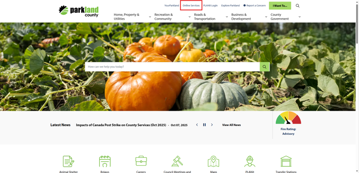 1. Visit www.parklandcounty.com and select 'Online Services' at the top of the page.
