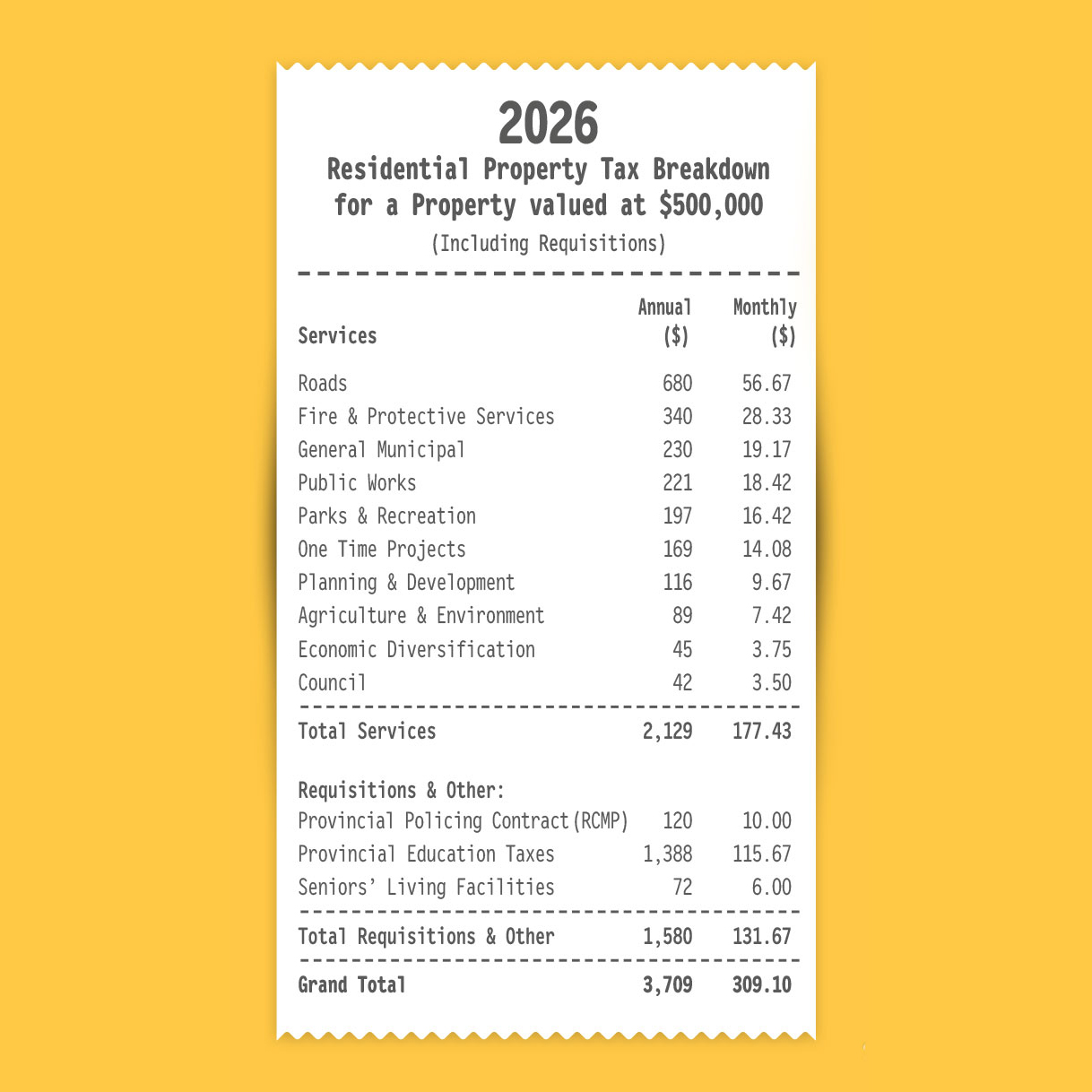 Check out the receipt below to see exactly where your tax dollars are spent, and how much of your property tax bill goes to Provincial and other requisitions.