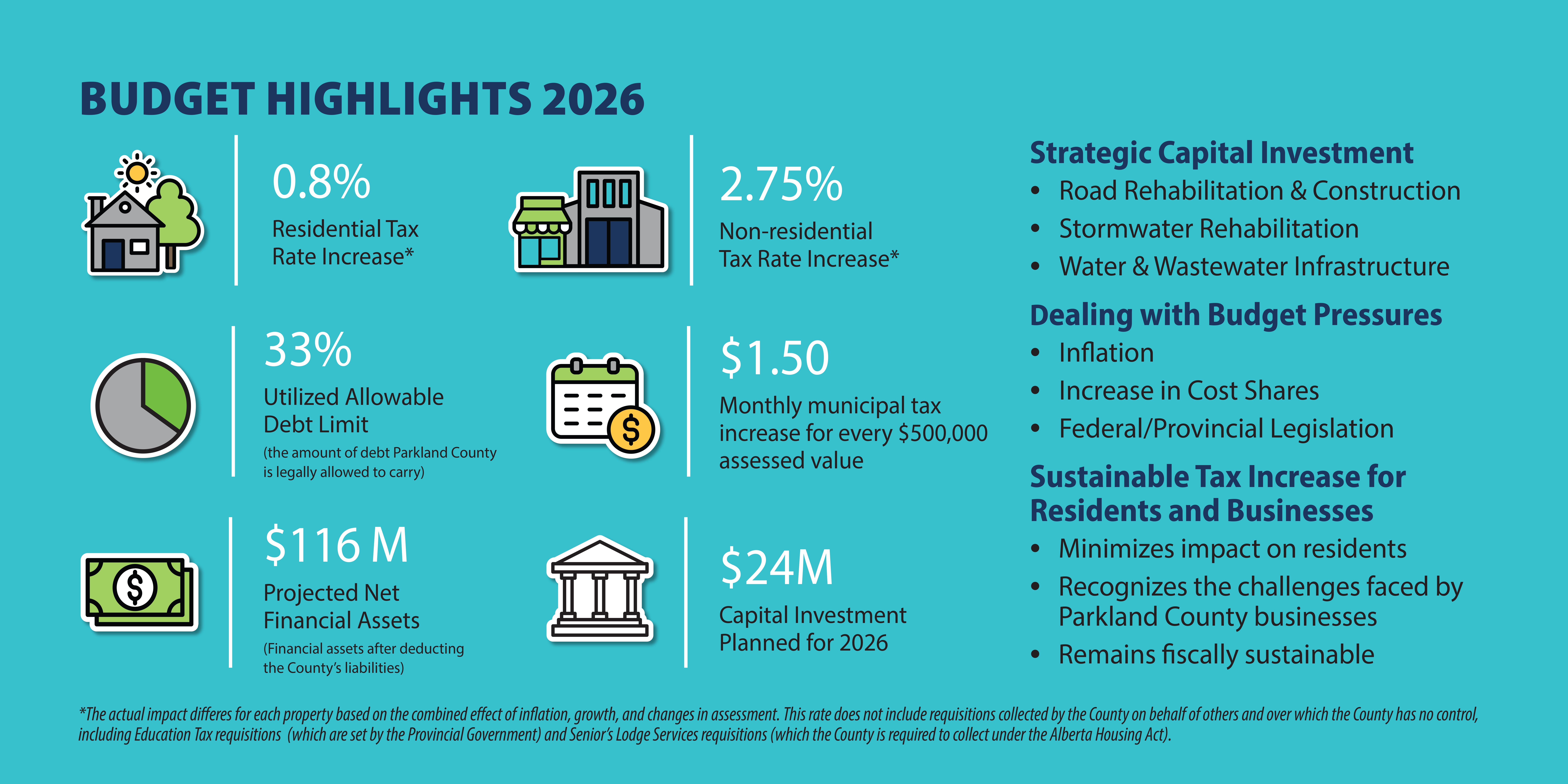 The County’s operating program revenue (e.g. the money that funds everyday County services) comes from a variety of sources. Non-residential property taxes provide for 40% of the $107.8 million budget, while residential property taxes provide for 33%. The remaining 27% comes from lots of different places. See the infographic below for a breakdown:
