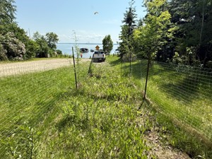 Live stakes of willow species were also installed along the west side of the beach. The roots of these willows provide stability to help keep the shoreline intact. The wildlife fencing was removed in fall of 2024. However, due to some damage to the area in summer of 2025, the upper fencing was reinstalled in October 2025.