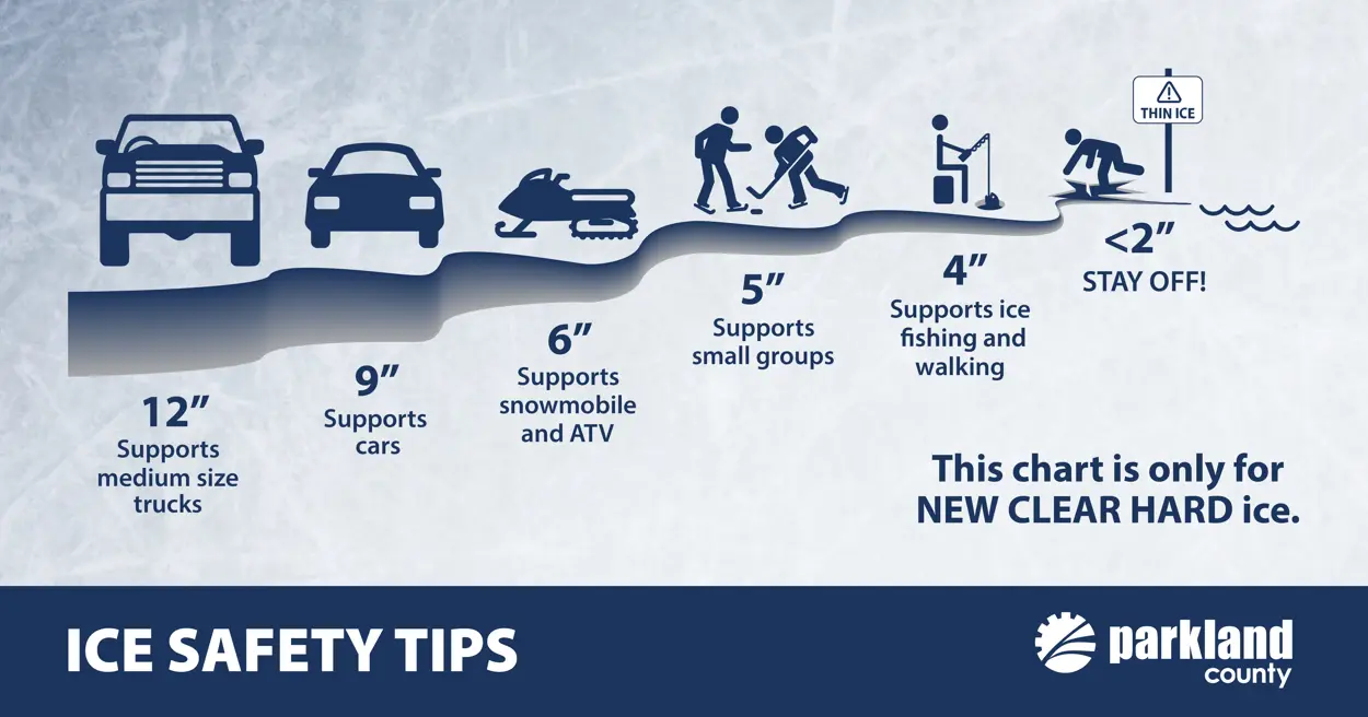 - Check local conditions: check online (Gov't of Alberta, 511 Alberta), and look for posted signs before going on the ice
