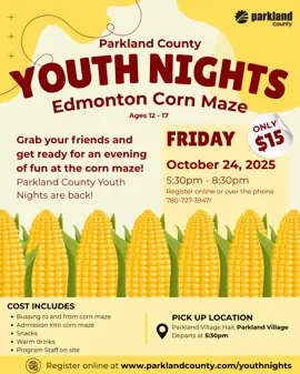 Parkland County Youth Nights are back with an a-MAZE-ing event at the Edmonton Corn Maze on Friday October 24 from 5:30pm to 8:30pm.