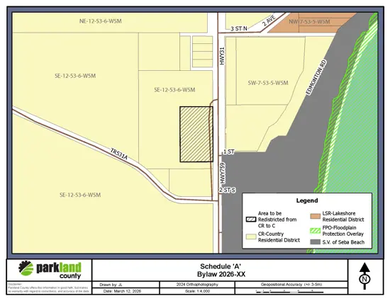 - To redistrict a parcel of land located at SE-12-53-6-W5 from Residential (R) to Commercial District (C) to facilitate future commercial land use.